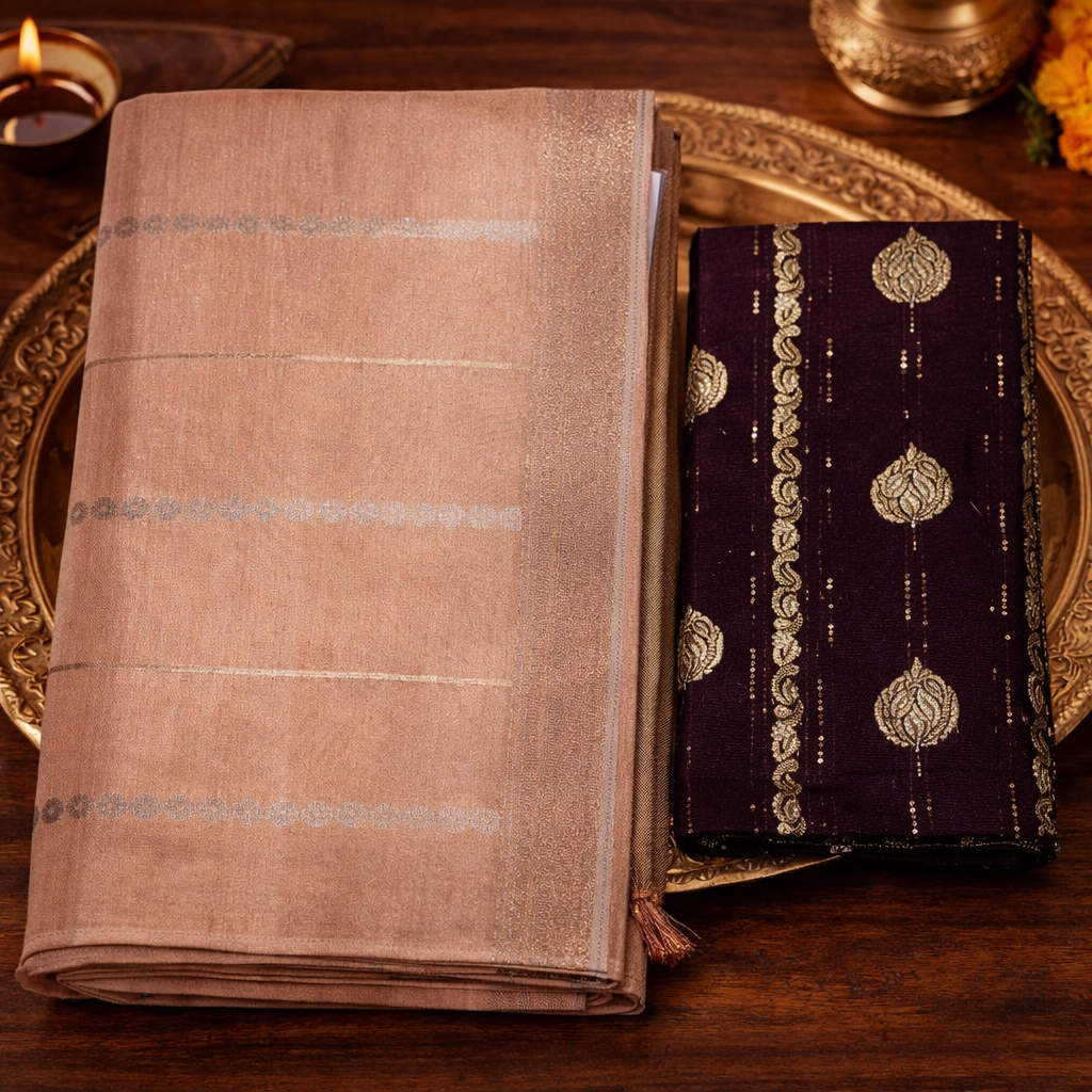 Peach Fancy Linen Silk Saree with Silver Border & Wine Contrast Blouse