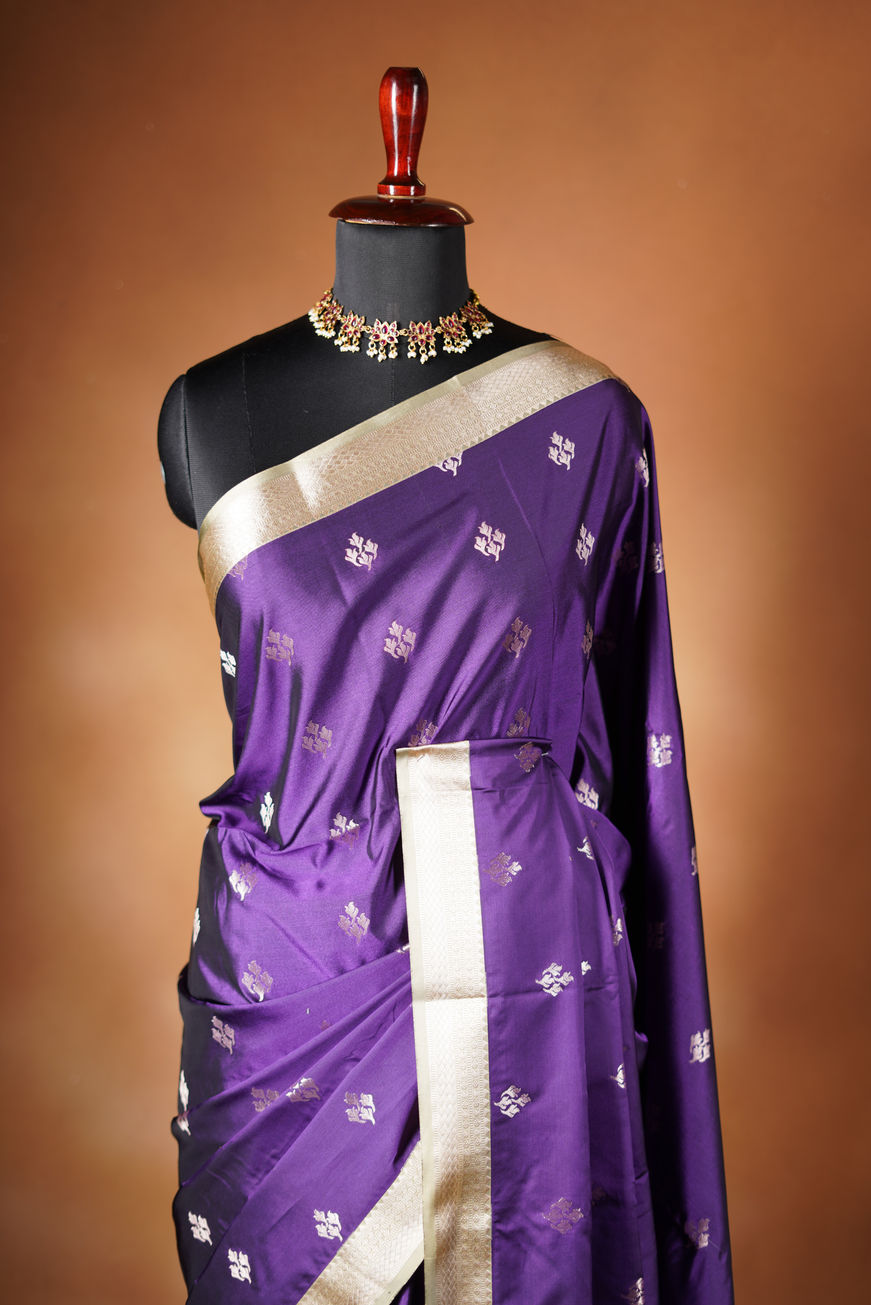 Royal purple soft silk saree densely woven zari pattern in a Champagne gold time finished with delicate hand - tied tassels for a added to touch of elegance and paired with blouse